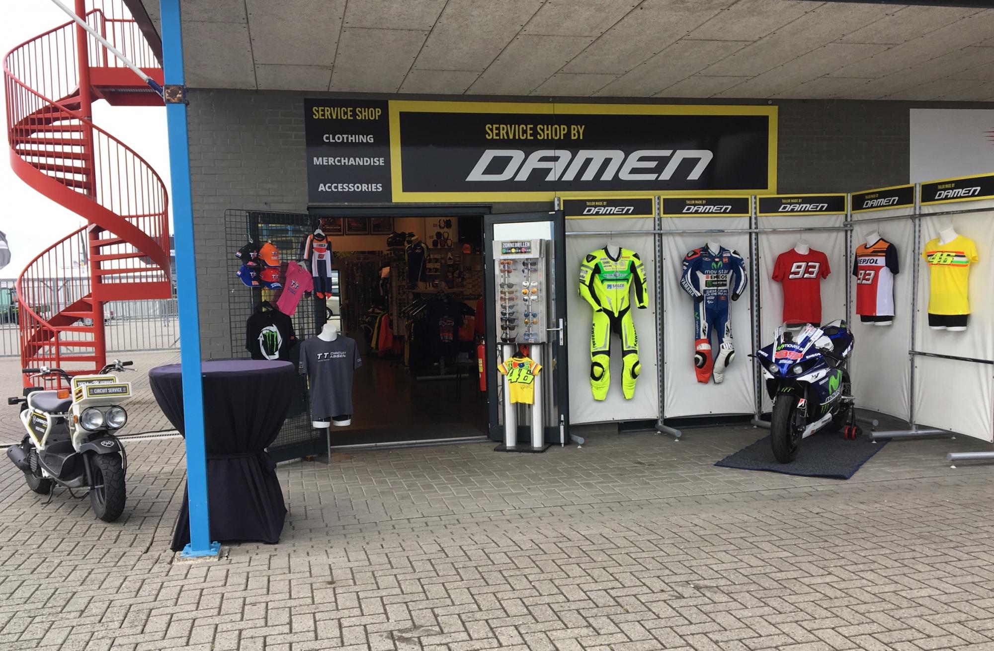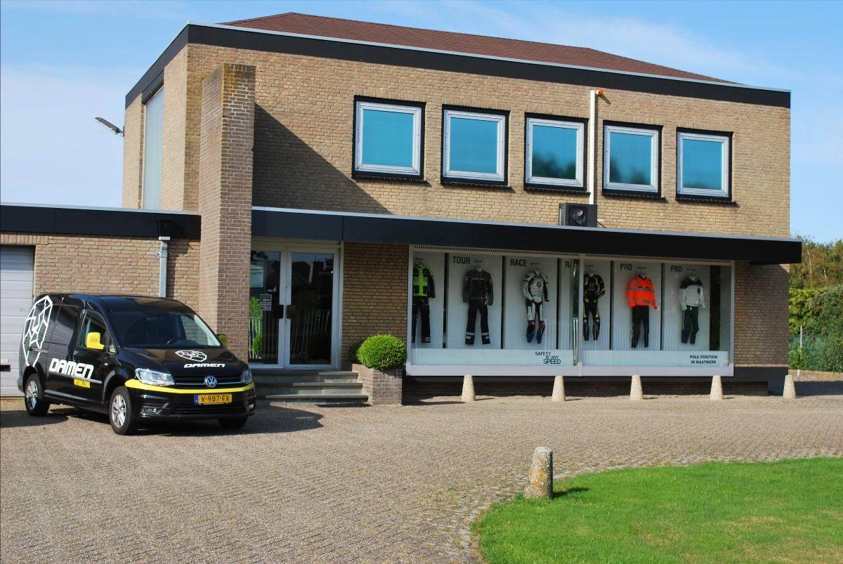 Das gesamte Sortiment hängt im Laden in Breda; jacken, hosen, handschuhe, Ein- und Zweiteilers. Das Anpassen von Motorradbekleidung ist hier sowohl für Tour- als auch für Rennanzüge möglich.