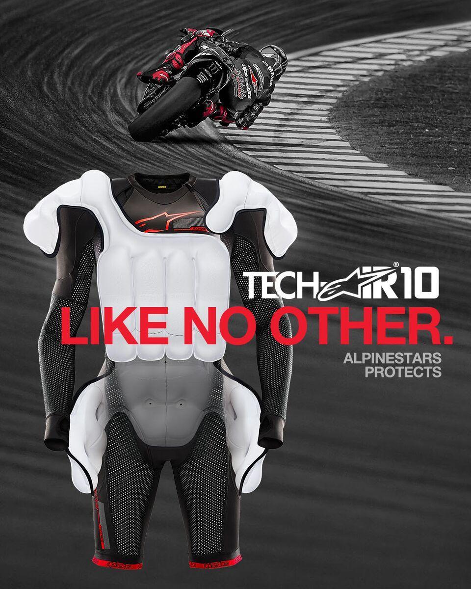 Tech-Air® 10 wurde entwickelt, um die Schultern, die Brust, den gesamten Rücken und die Hüften von Motorradfahrern zu schützen und bietet die umfassendste Abdeckung aller derzeit erhältlichen Airbags. Der Tech-Air® 10 verfügt über die CE-Zertifizierung Level 2 sowohl für die Brust als auch für den Rücken. Die Stoßdämpfung beim Tragen des Airbags führt zu einer Reduzierung der Aufprallkraft um bis zu 95 % im Vergleich zu einem passiven Protektor.