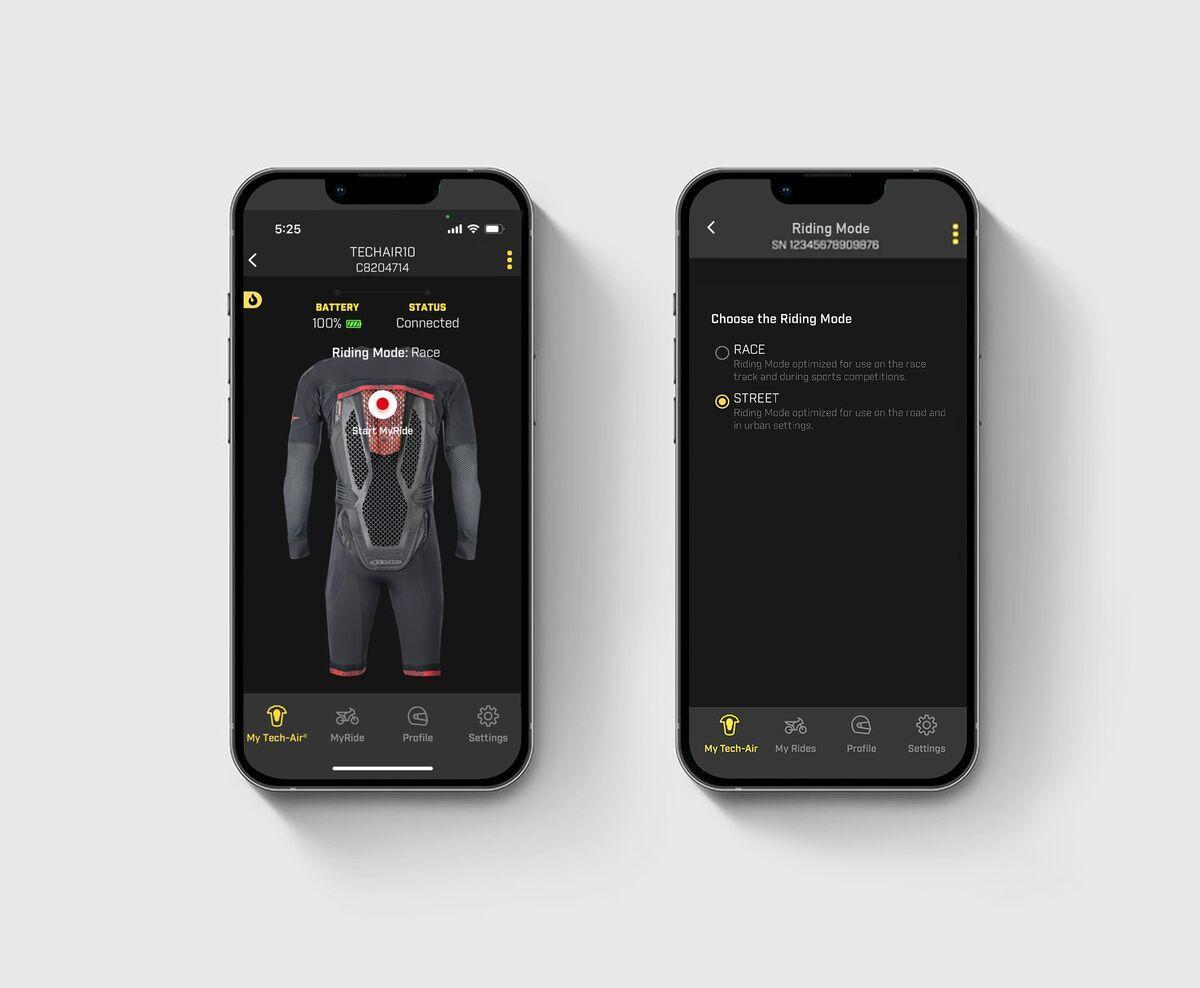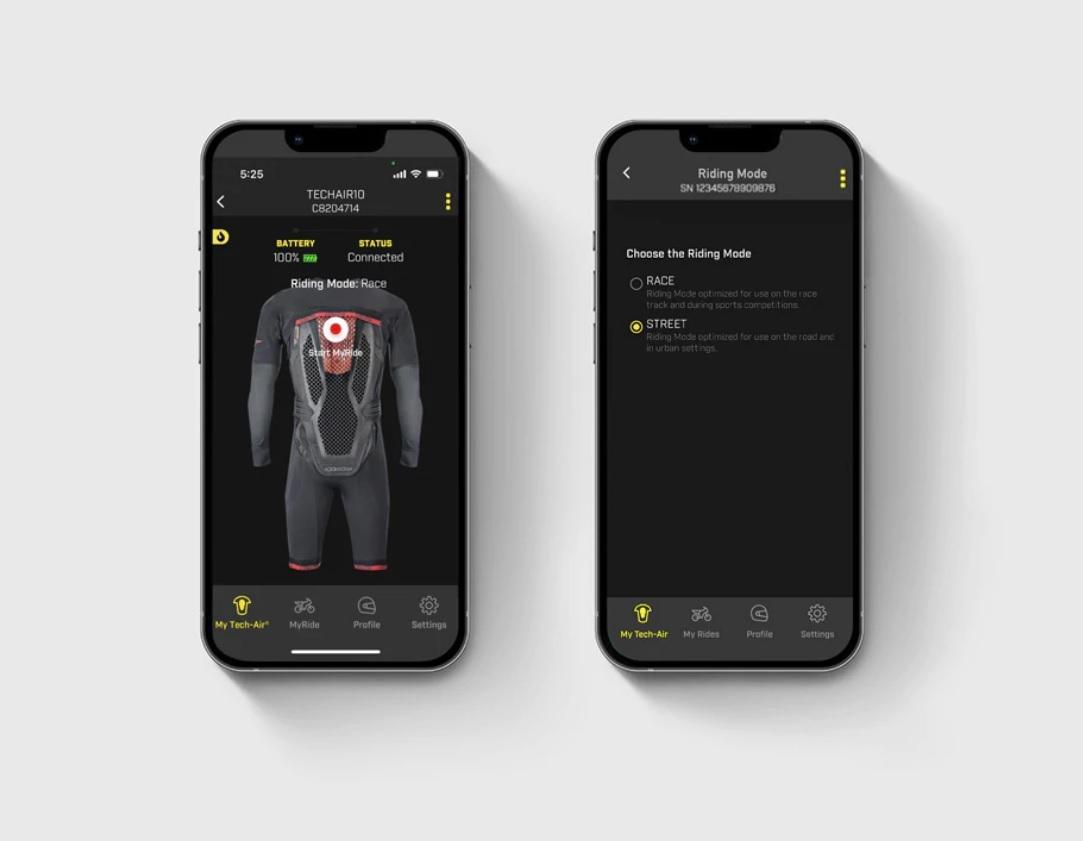 Die Bluetooth-Konnektivität mit einer Tech-Air®-App versorgt Fahrer mit dem Betriebsstatus des Airbagsystems, dem Batteriestatus und MyRide-Fahrtinformationen. Über die Tech-Air®-App können Fahrer die System-Firmware auch aktualisieren, wenn: neue Unfallerkennungsalgorithmen veröffentlicht werden.